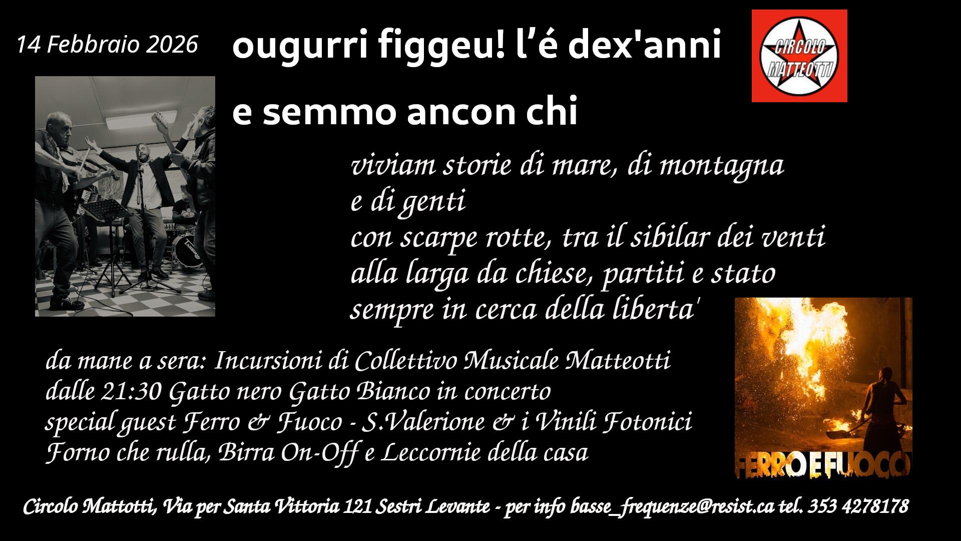 ougurri figgeu! l’e’ dex’anni e semmo ancon chi Dettaglio eventi Data: 14 Febbraio 2026 11:30 – 23:59 Categorie: cena sociale, concerto, pranzo sociale, teatro