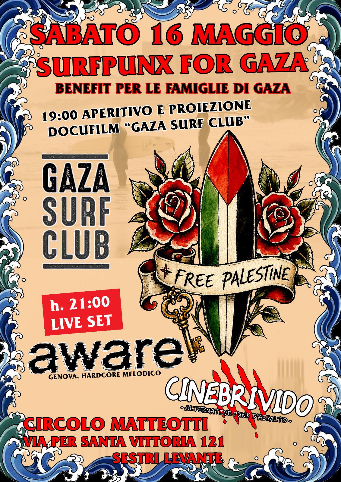 SurfPunx for Gaza Dettaglio eventi Data: 16 Maggio 2026 19:00 – 23:55 Categorie: cassa solidale, concerto, documentario Tag: benefit, gaza
